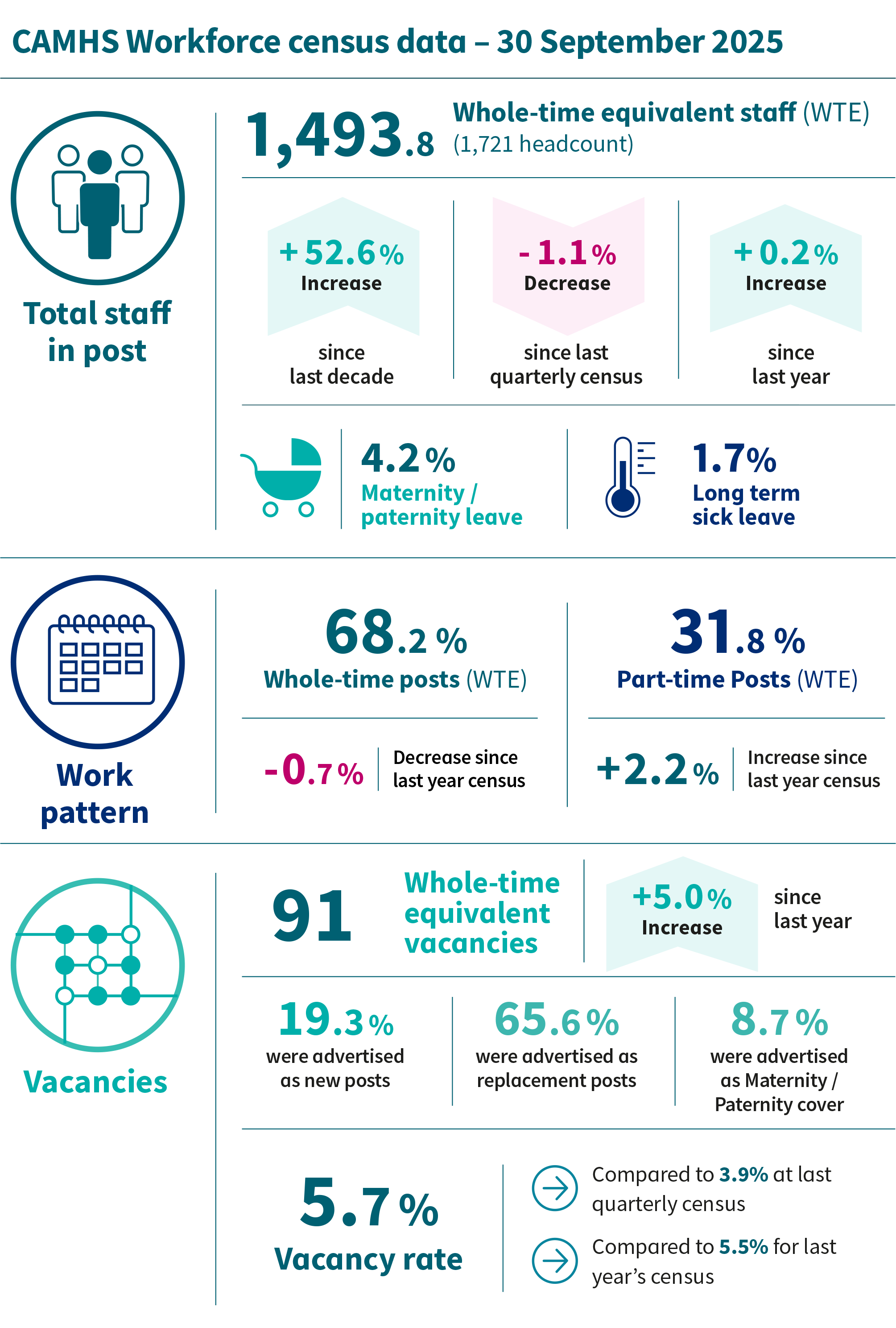 This release by NHS Education for Scotland (NES) provides a quarterly update, as at 30 September 2025, on the Child and Adolescent Mental Health Services (CAMHS) workforce staff in post and vacancies.