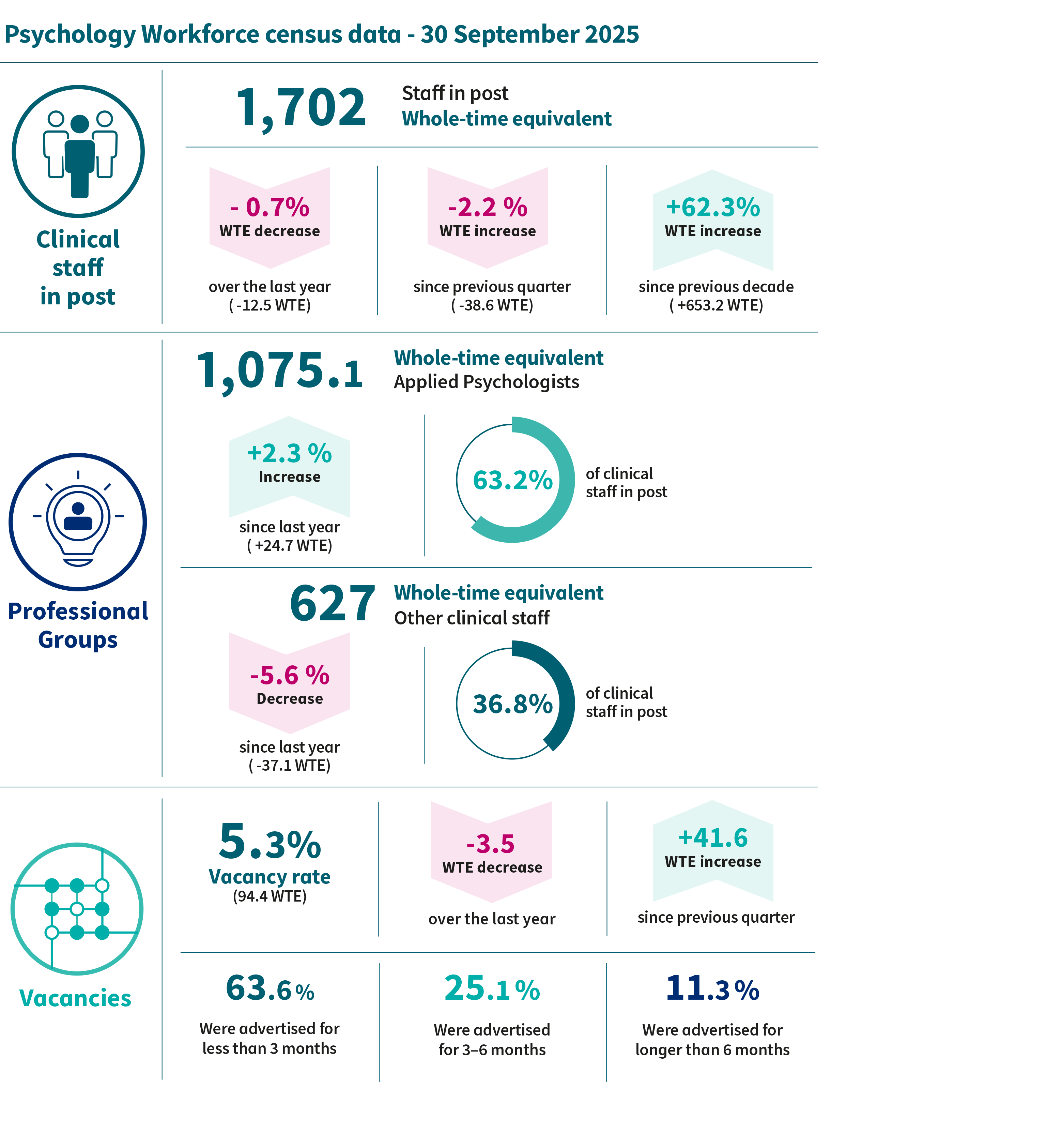 This release by NHS Education for Scotland (NES) provides a quarterly update, as at 30 September 2025, on the Psychology Services workforce staff in post and vacant posts.